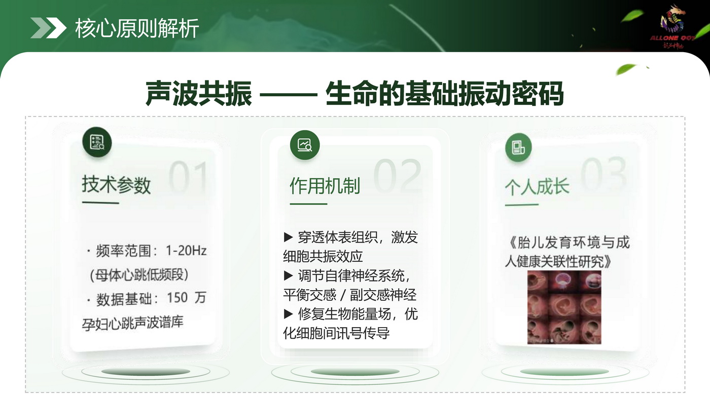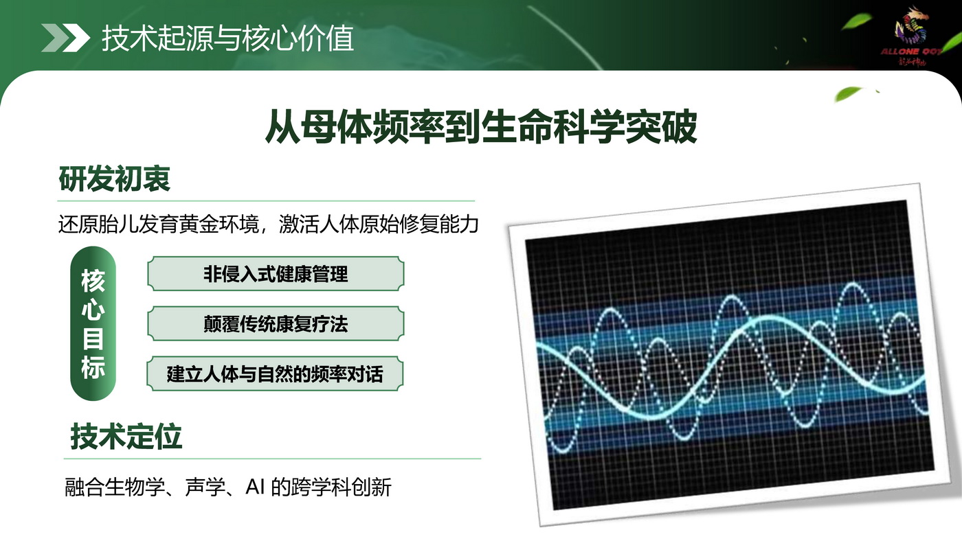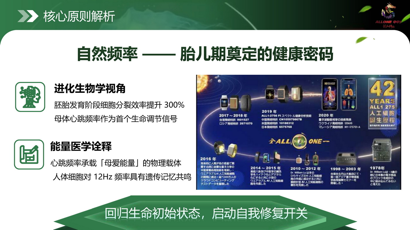 與光同行 用愛共鳴 ALLONE QQT SYSTEM. Mother's Way Core Principles ALLONE QQT 核心原理 ALLONE QQT(也稱為ALL1-UFO或龍骨神曲QQT)是超前的聲波共振技術,用自然頻率產生身體的自我修復能力,使細胞恢復活力,平衡脊柱偏差,提高睡眠質量。 它基於母體心跳的基本頻率,創造了一個類似於最佳胎兒發育環境的生物能量場。